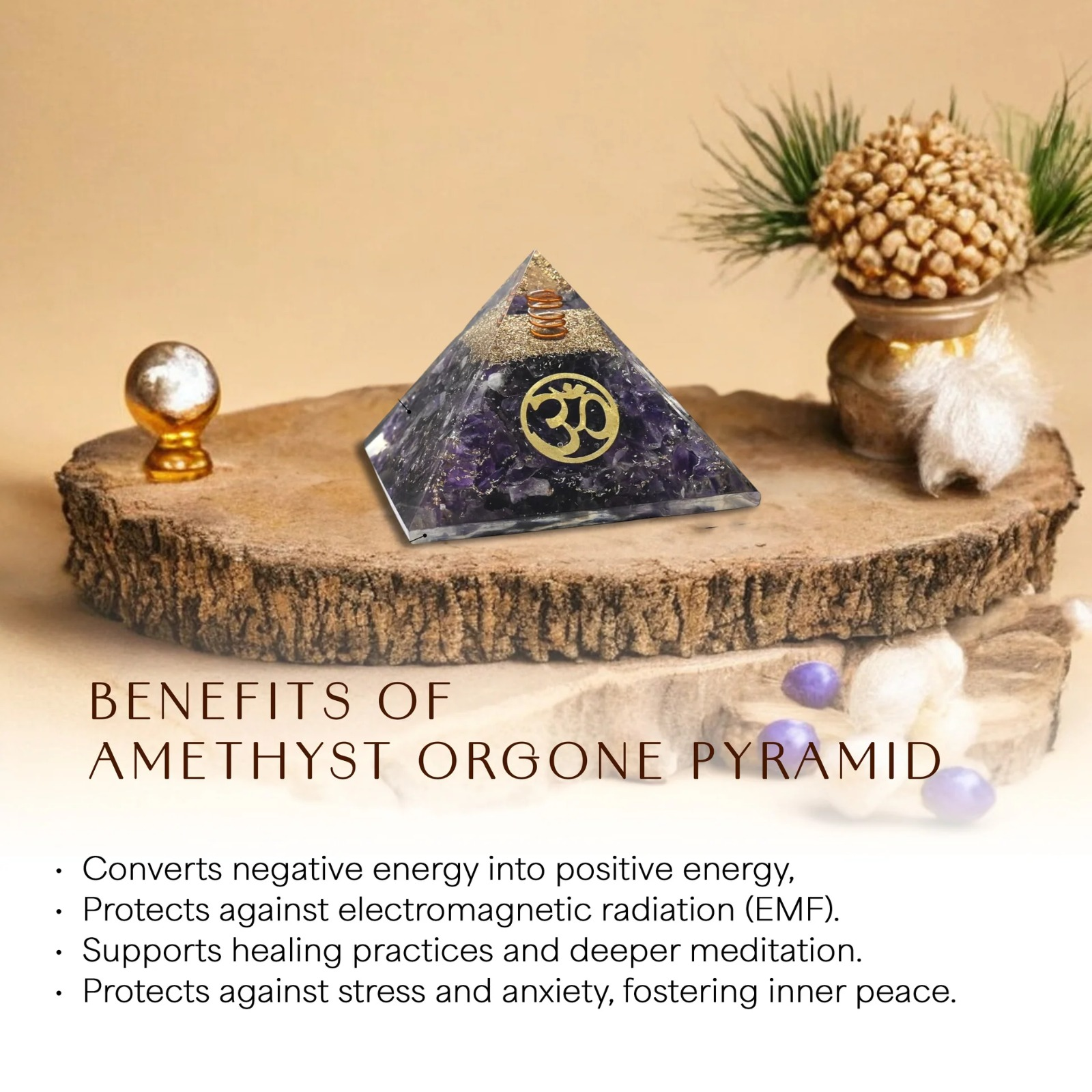 Amethyst Om Symbol Orgone Pyramid – Natural Crystal Energy Generator for Peace, Protection & Spiritual Balance | Handmade Resin Pyramid with Copper Coil & Om Emblem | Meditation & Home Décor