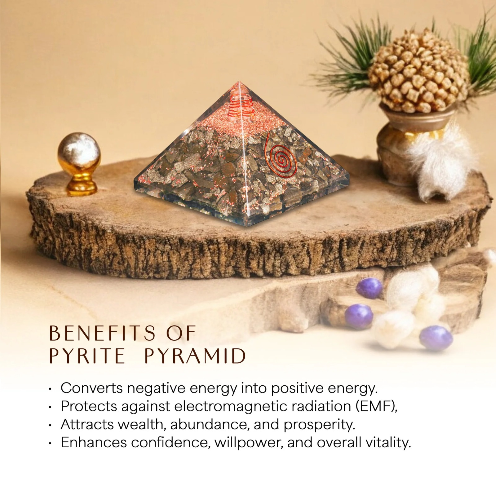Pyrite Orgone Pyramid – Natural Crystal Energy Generator for Prosperity, Confidence & Positive Vibrations | Handmade Resin Pyramid with Copper Coil & Metal Shavings | Home, Office & Meditation Décor